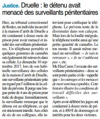 Druelle : le détenu avait menacé des surveillants pénitentiaires